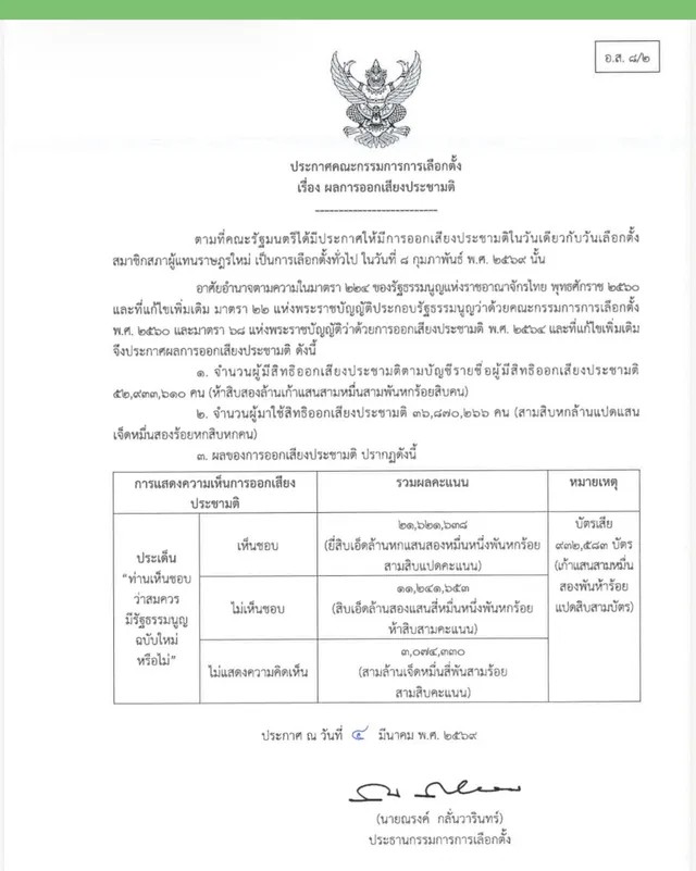 เมื่อวันที่ 4 มีนาคม 2569 สำนักงานคณะกรรมการการเลือกตั้ง (กกต.) เผยแพร่ ข่าวเลขที่ 201/2569 เรื่อง ผลการออกเสียงประชามติ ซึ่งจัดขึ้นเมื่อวันที่ 8 กุมภาพันธ์ 2569 ว่า